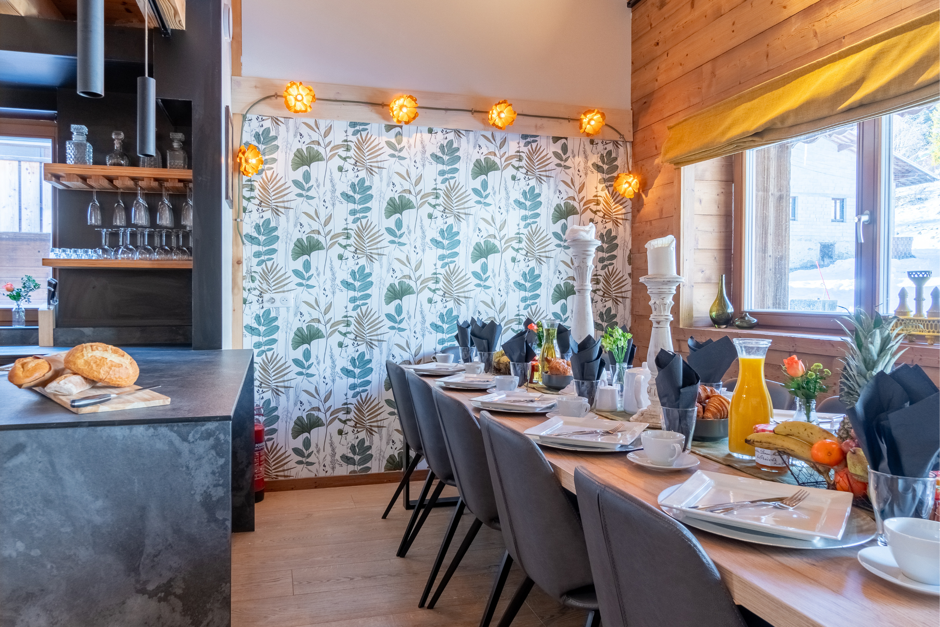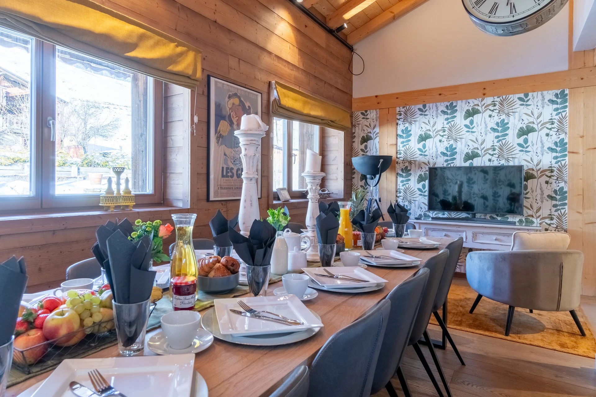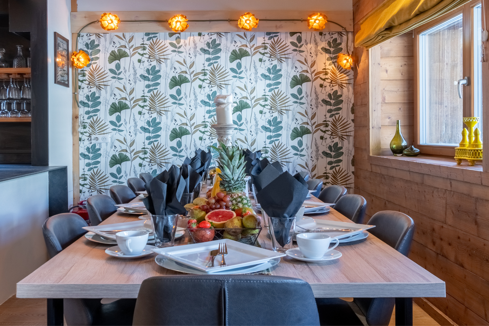 Living roomThe living room boasts generous seating for up to 12 guests, featuring two luxurious velvet sofas and four snug armchairs that create an inviting atmosphere for socialising. The comforting glow of the log burner enhances the space, making it the perfect retreat to relax and unwind. With direct access to the balcony, the living room is an ideal gathering spot after a long day on the mountain.
