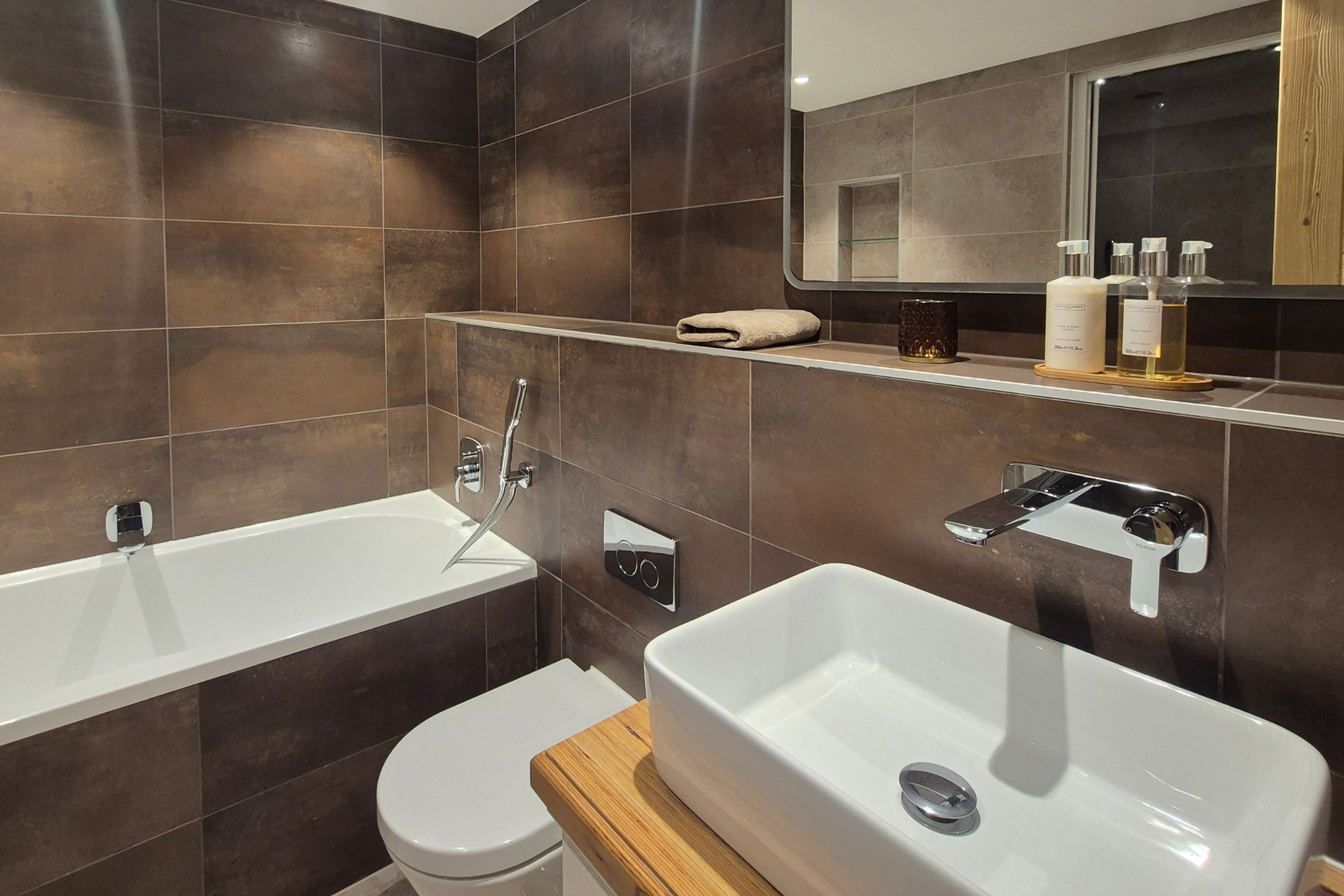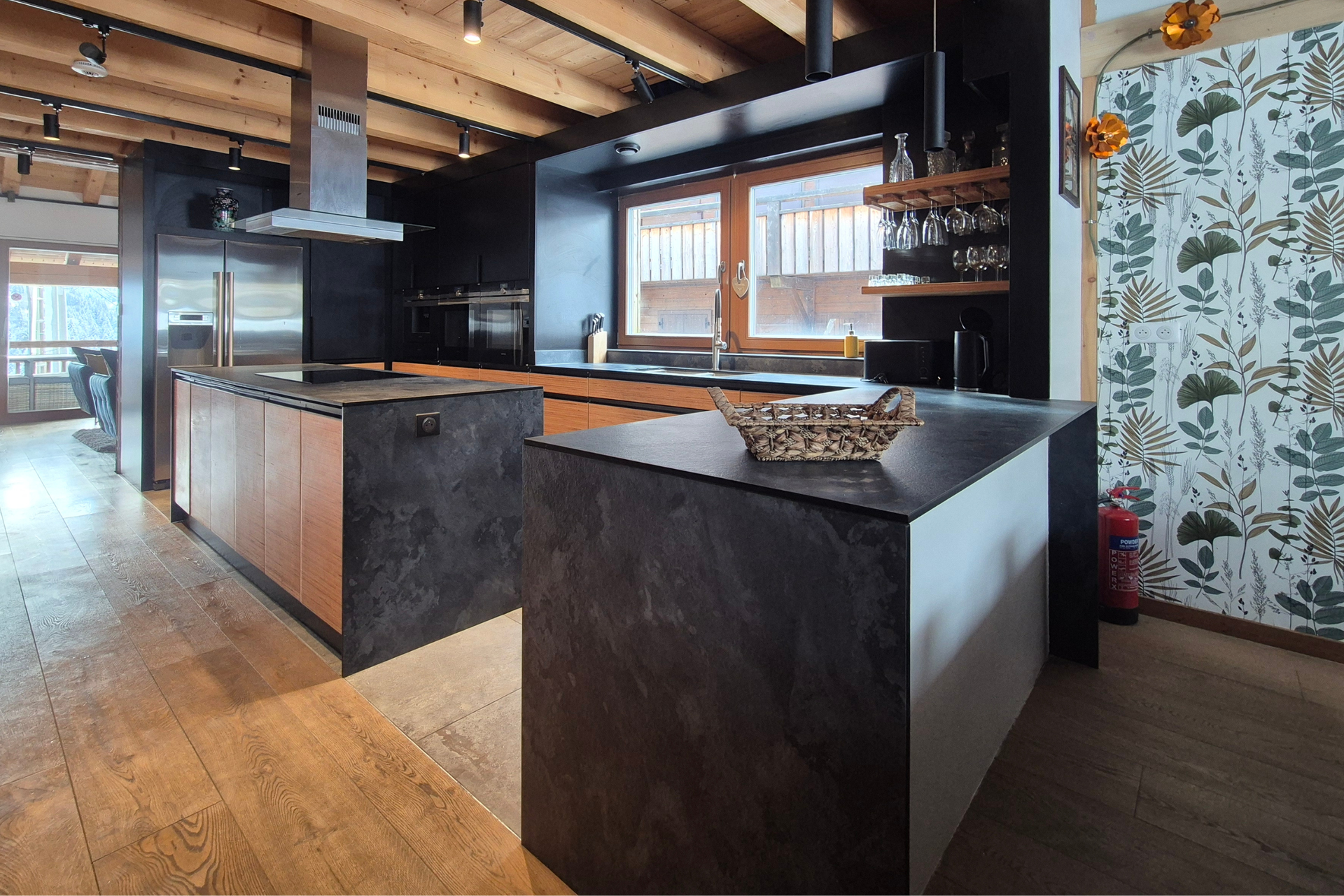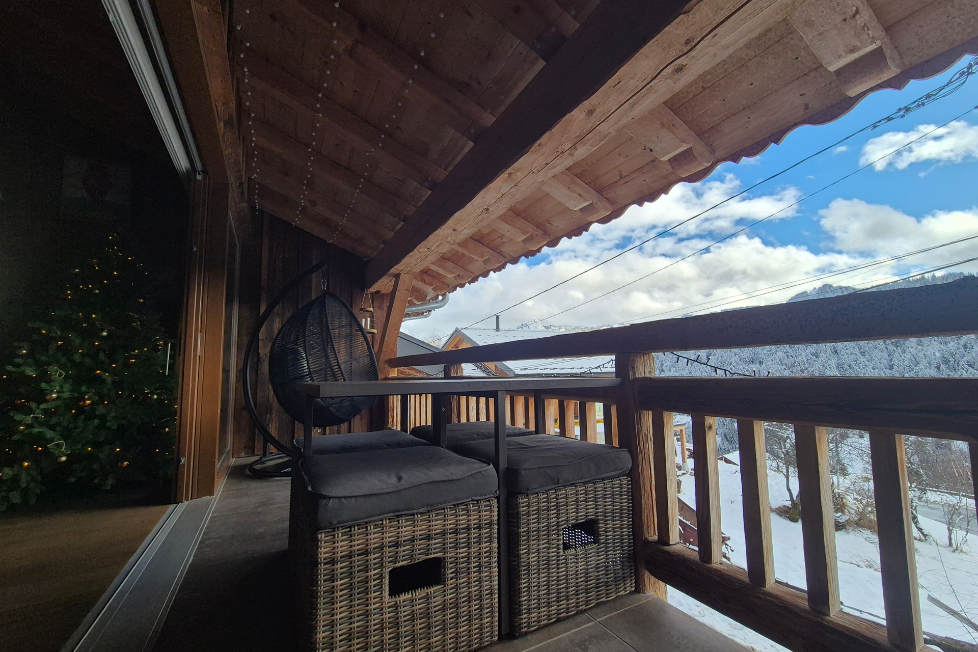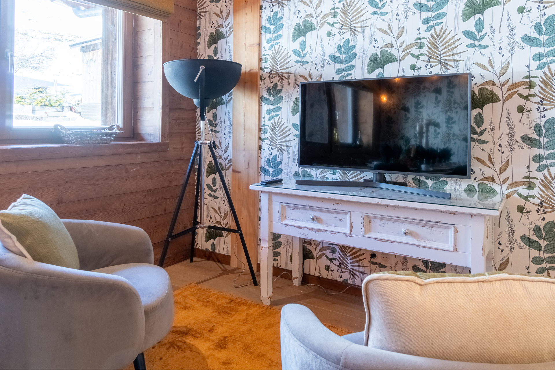 Living roomThe living room boasts generous seating for up to 12 guests, featuring two luxurious velvet sofas and four snug armchairs that create an inviting atmosphere for socialising. The comforting glow of the log burner enhances the space, making it the perfect retreat to relax and unwind. With direct access to the balcony, the living room is an ideal gathering spot after a long day on the mountain.