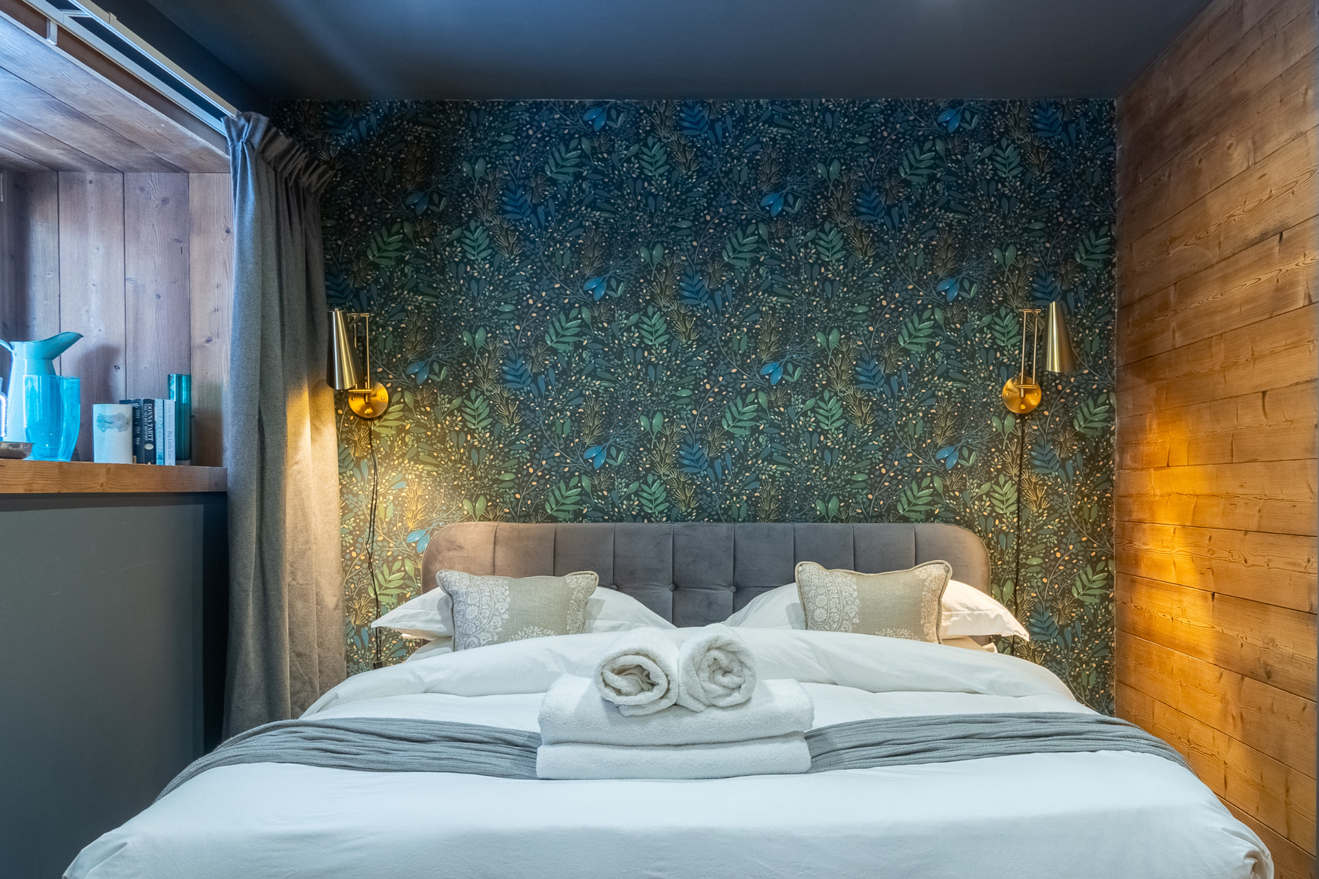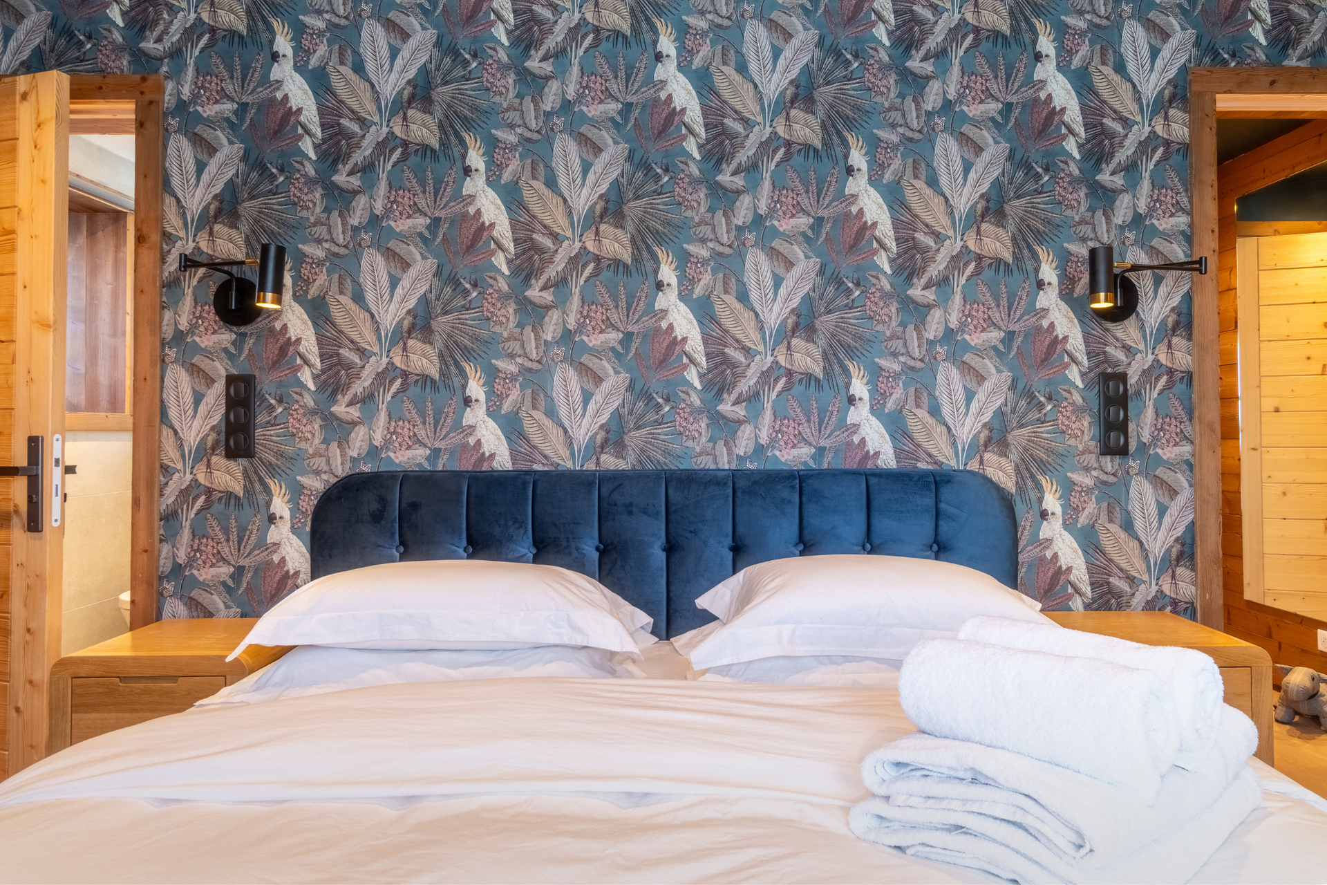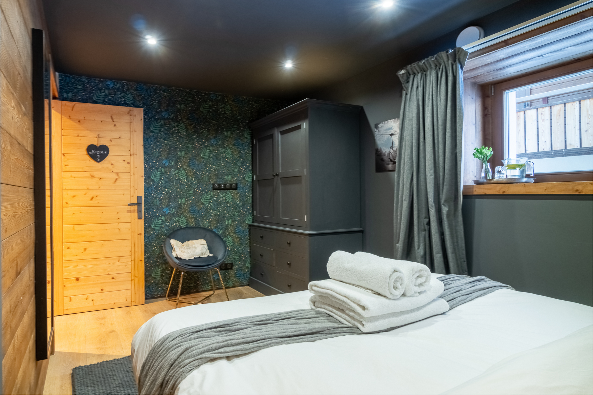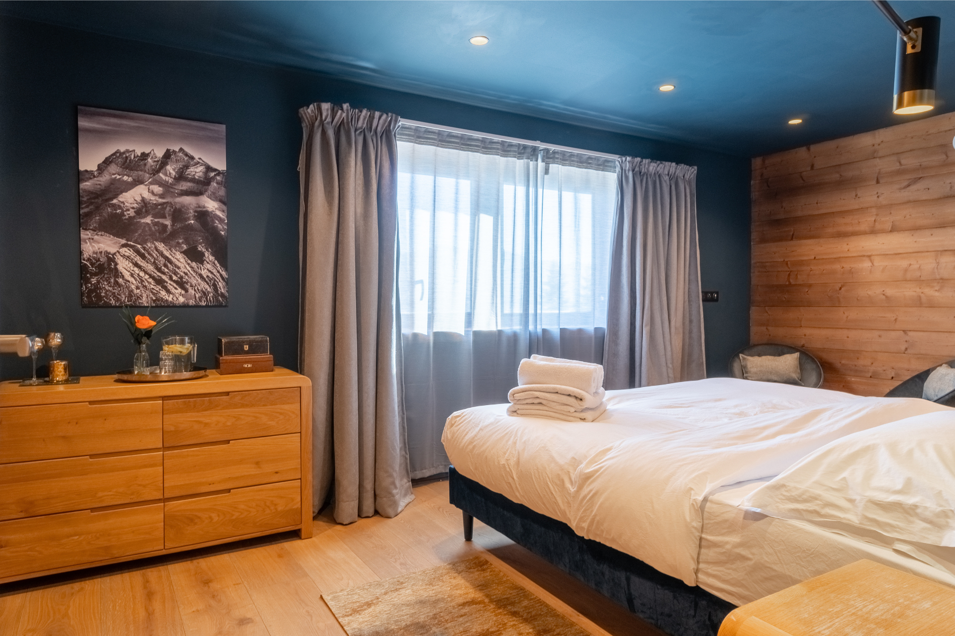 Bedroom 1Bedroom 1 sleeps 2 guests in a super king bed with Egyptian cotton bedding and has a private ensuite shower room and a large walk-in wardrobe. This bedroom is at the front of the chalet, offering mountain views. This room can also accomodate an extra guest on a fold away bed. This bed would suit a child under the age of 14.