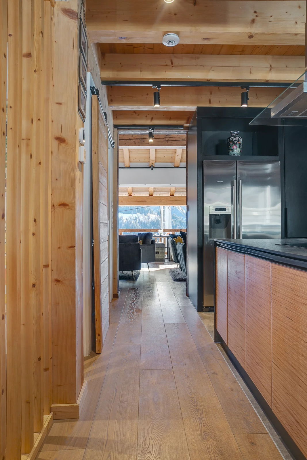 LE 1ER ÉTAGE est ouvert avec la cuisine au cœur de la maison, entièrement équipée avec des appareils Siemens, un réfrigérateur-congélateur américain, un refroidisseur à vin, une machine à café, 2 fours, une plaque à induction, un lave-vaisselle, un lave-linge et un sèche-linge. La salle à manger donne sur le jardin et dispose de plafonds à double hauteur avec une grande table à manger pour 12 personnes, une petite aire de jeux pour enfants et une Smart TV. Le chalet dispose d'un local à chaussures avec des casiers à chaussures chauffants. Le salon offre des plafonds à double hauteur, de nombreux sièges et un poêle à bois.