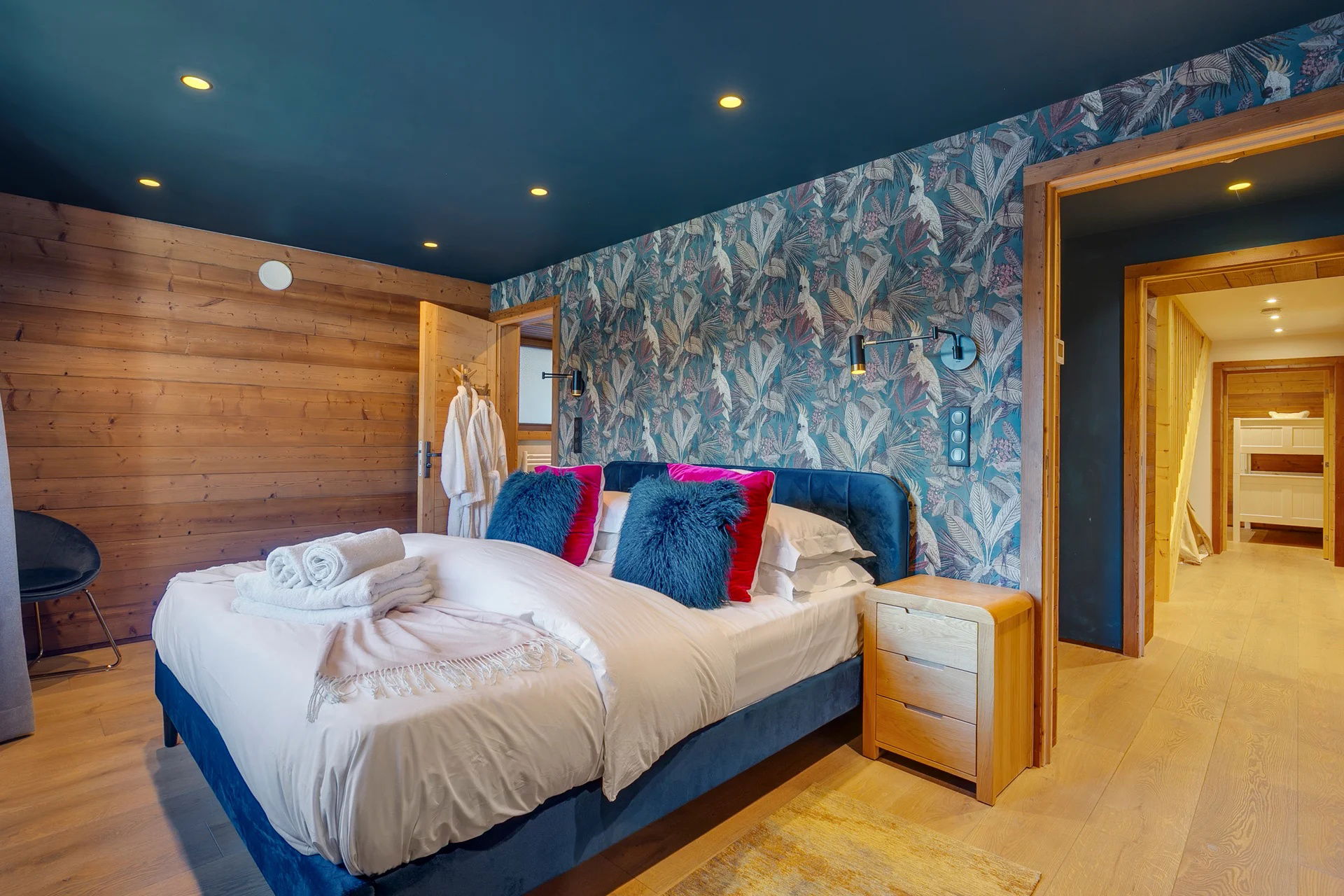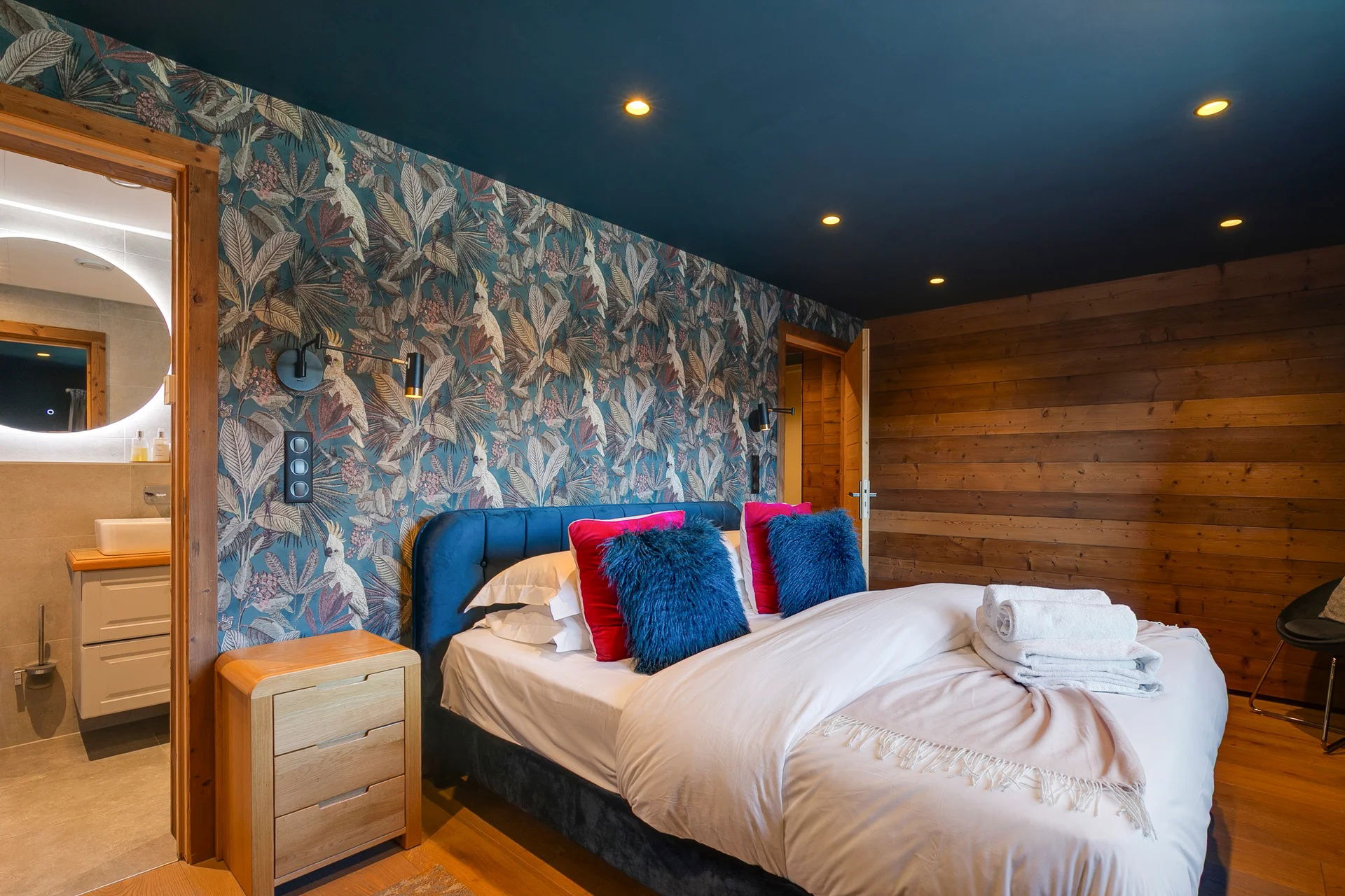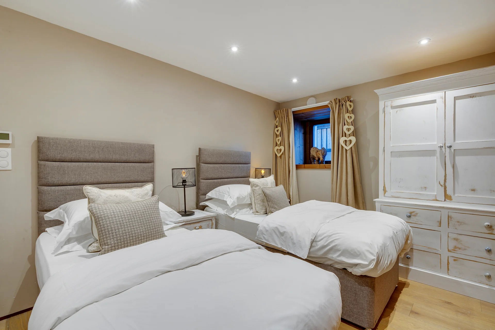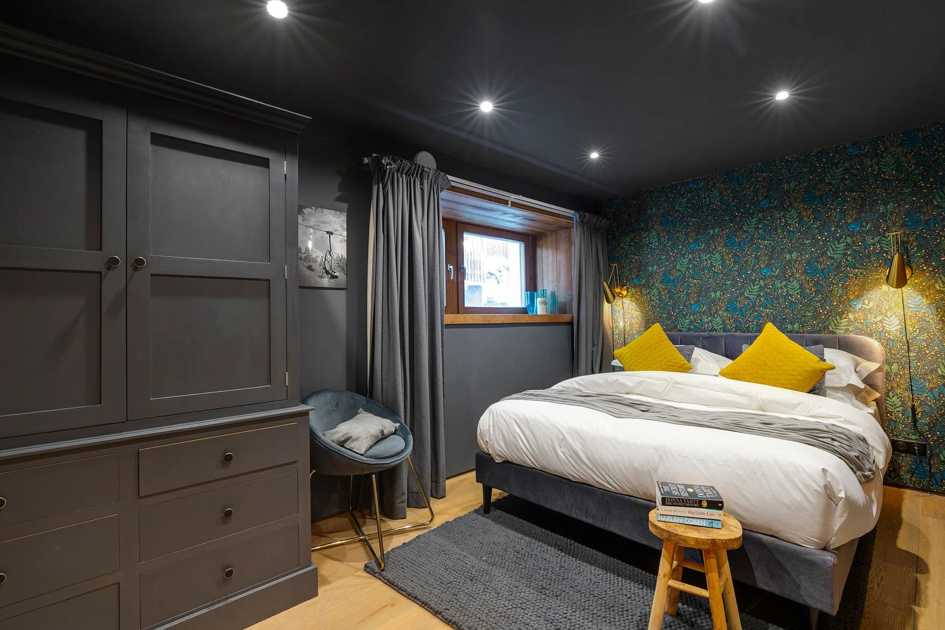 This bright master bedroom sits at the front of the chalet and looks straight out to the mountains. It has a comfy super king bed (180 cm) made up with premium Egyptian cotton linens, a private ensuite shower room, and a large walk-in wardrobe with plenty of space for your things.