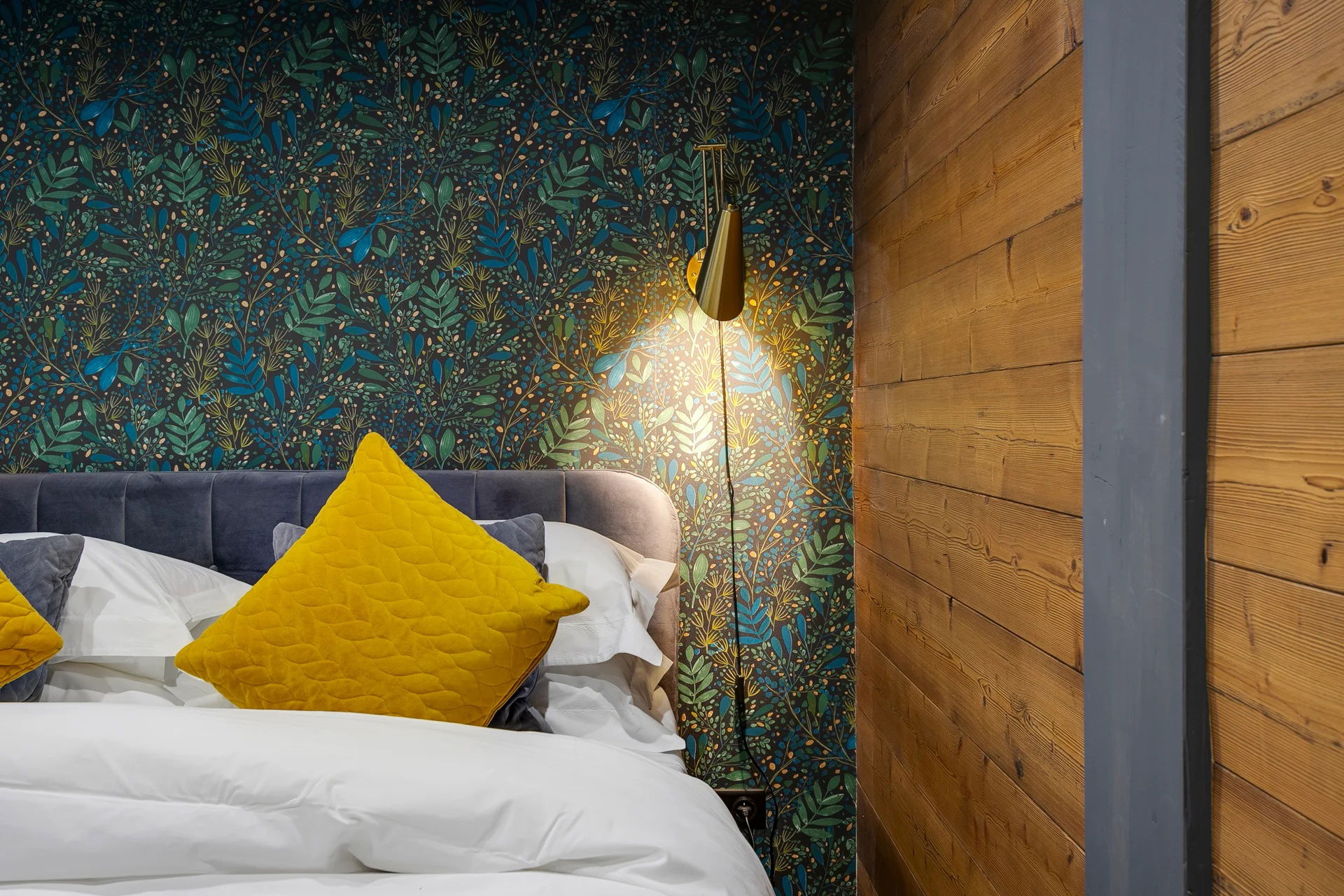 A calm, cosy room with a king-size bed (150 cm) dressed in premium Egyptian cotton linens. There’s good storage with a wardrobe, drawers, and bedside tables. This room shares a large family bathroom with Bedroom 3.
