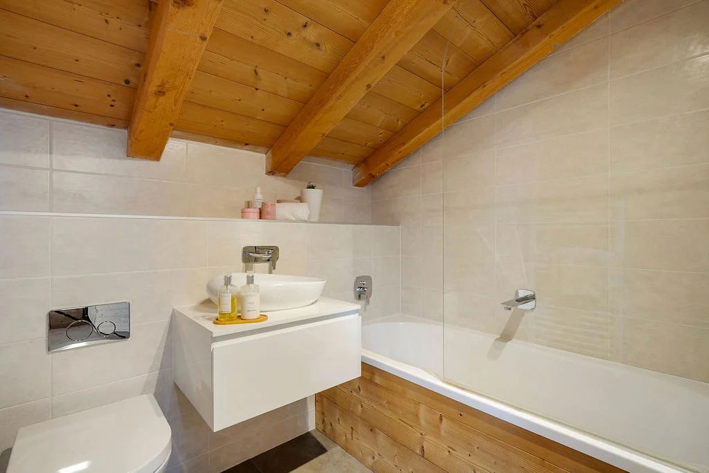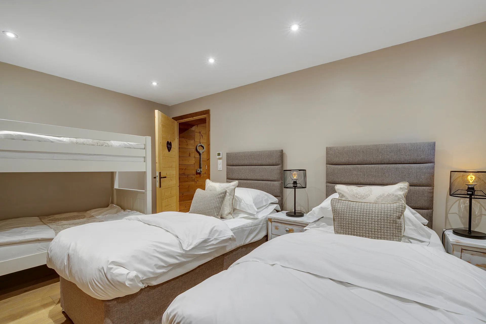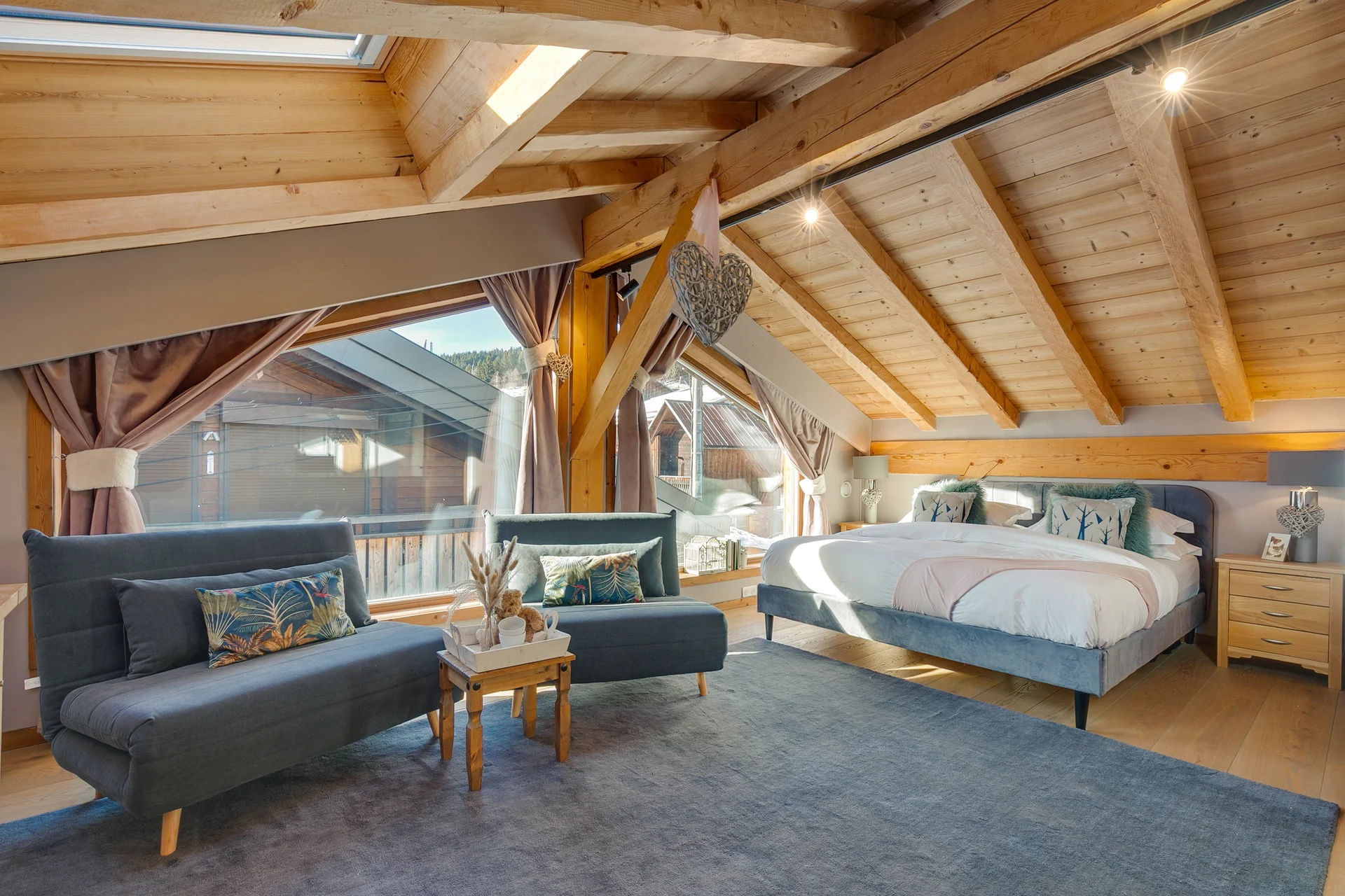 This is a real highlight of the chalet. The suite sits on its own level, reached by a private staircase, giving it a lovely sense of space and privacy. With high vaulted ceilings and big windows, it feels light and airy. It comfortably sleeps four — two in a super king bed (180 cm) dressed in premium Egyptian cotton linens, and two on single sofa beds (100 x 200 cm). There’s also a private ensuite bathroom with both a bath and shower, plus plenty of storage.